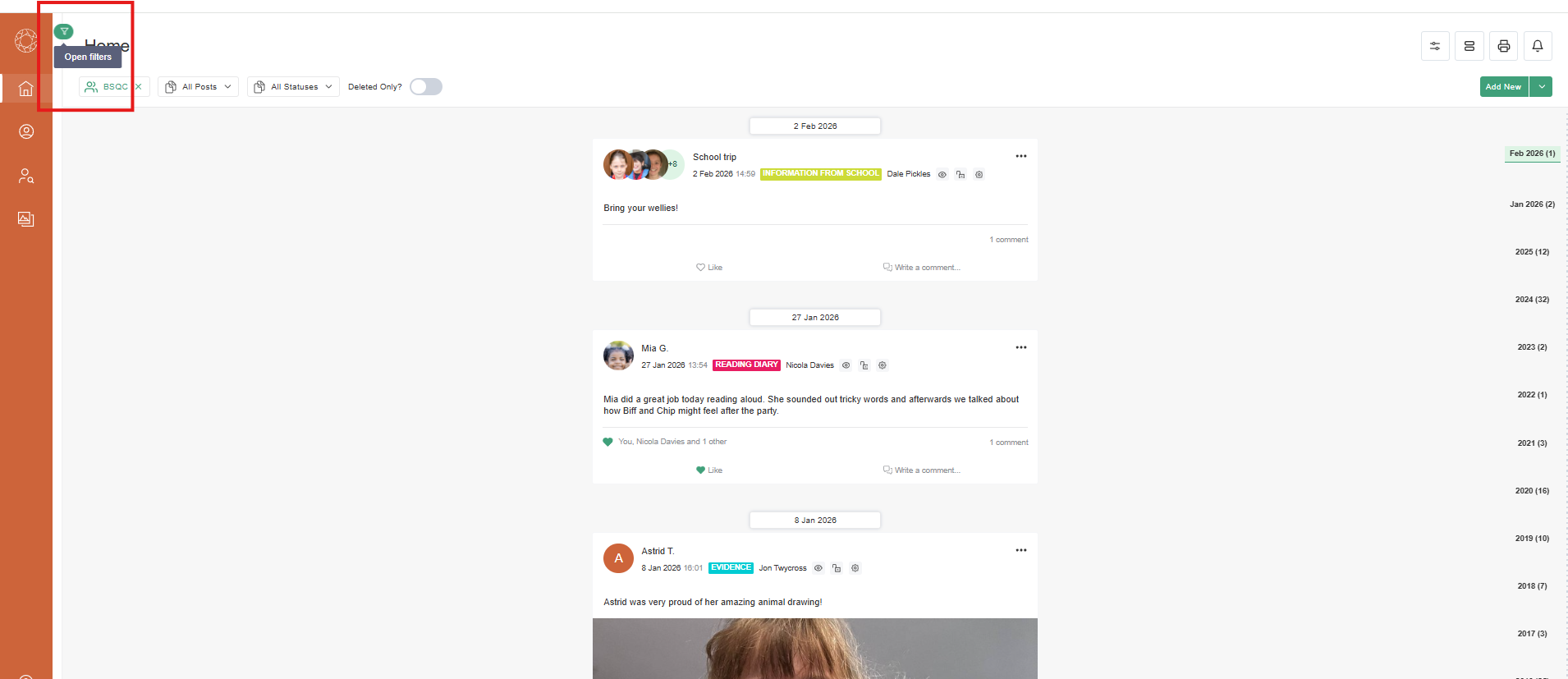 The timeline allows you to jump back in time to look at evidence or other posts. This is a great way to show progress for a student, to compare their work from 2 or 3 years ago to something they have created now. It is simple to use and the dates on the timeline and the post counts update based on any filters you have applied. The guide below shows you how easy it is to use.