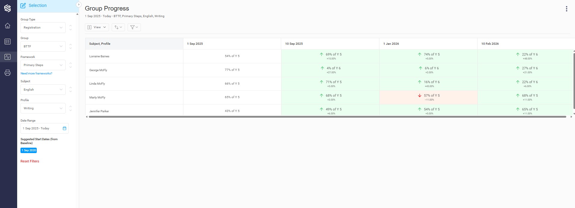 This report shows the linear progress of a group for one subject/profile over a time period. It is a quick and simple visual overview of each pupil's linear progress and attainment.