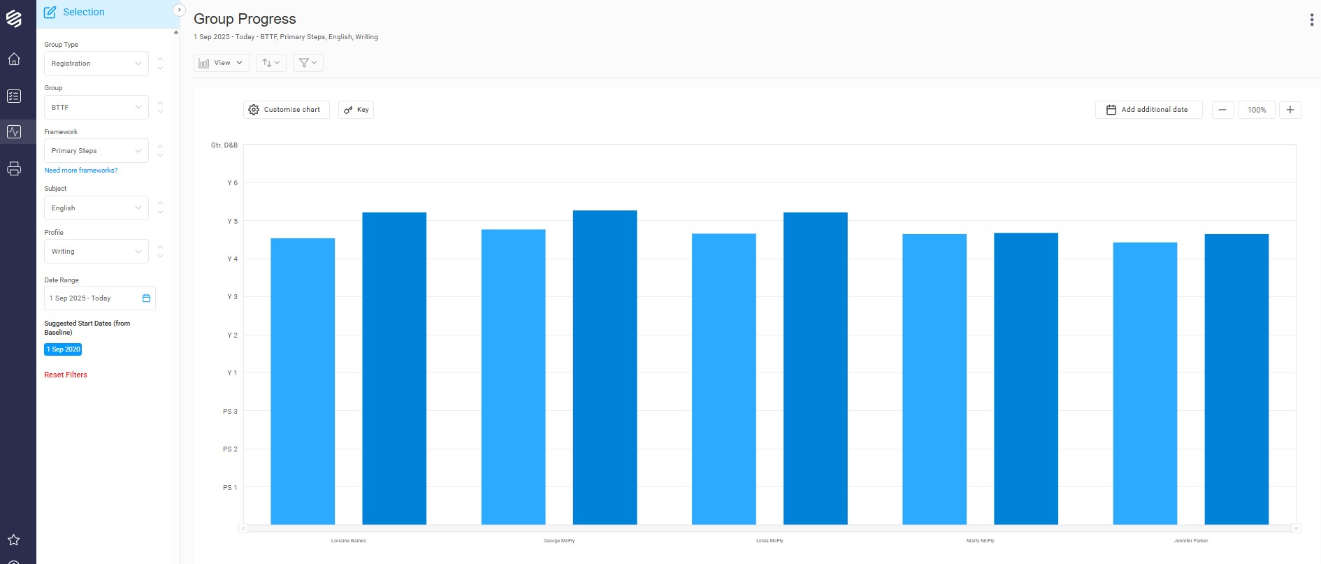 This report, by default, is a bar chart and shows how each student's attainment changes over two dates, showing the progress made. You can choose to add an additional date to show a midpoint and how the rate of progress may have increased or decreased over time.